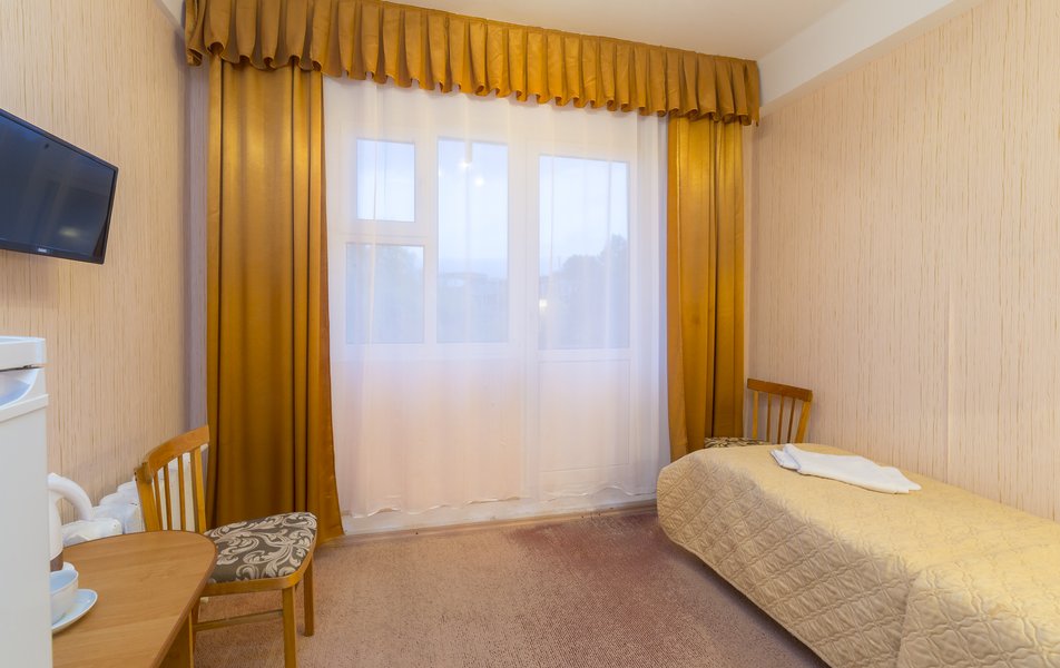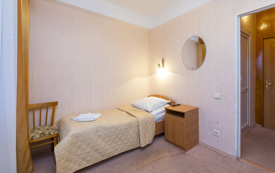 В жилых корпусах санатория есть одноместные номера. Все оформлены в светлых тонах, в комнате большое окно и балкон, на полу ковровое покрытие.